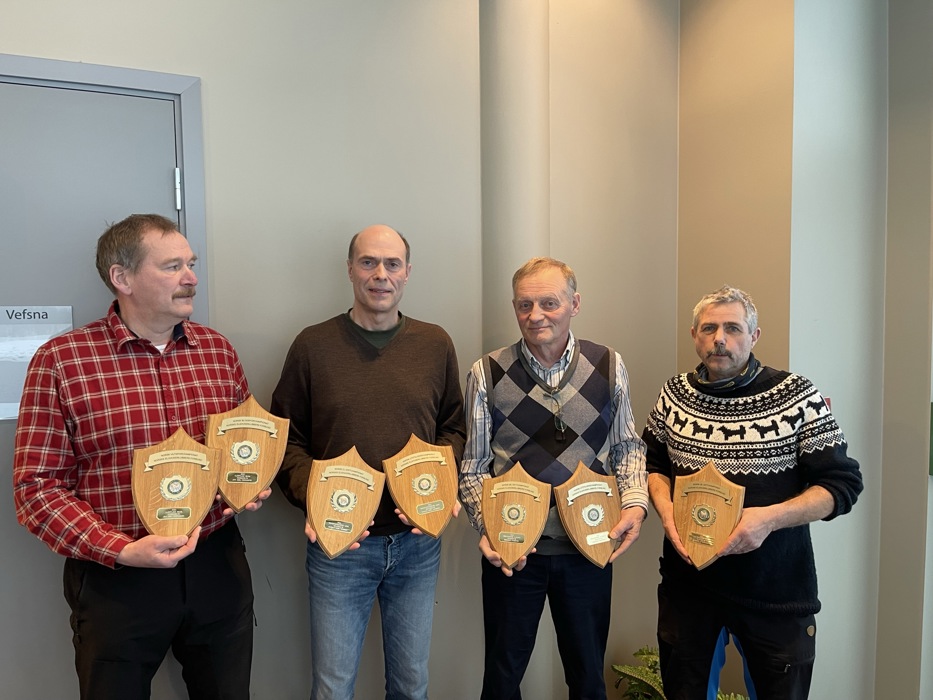 På bildet så ser dere fra venstre: Jan Egil Nordgård/Hjortelias Saga (Blod- og viltsporchampion), Harald Hoel Hammer/ Gokstadhaugens Luna (Løshund- og utstillingschampion), Sigmund Fagervik/Zanto (Bandhund- og utstillingschampion), Verner Yttervoll/Holthehagens Alvin (Bandhundchampion).